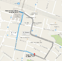 You can reach us from the station of Parma in just 6 minutes walk on foot along the path outlined by blue dots.